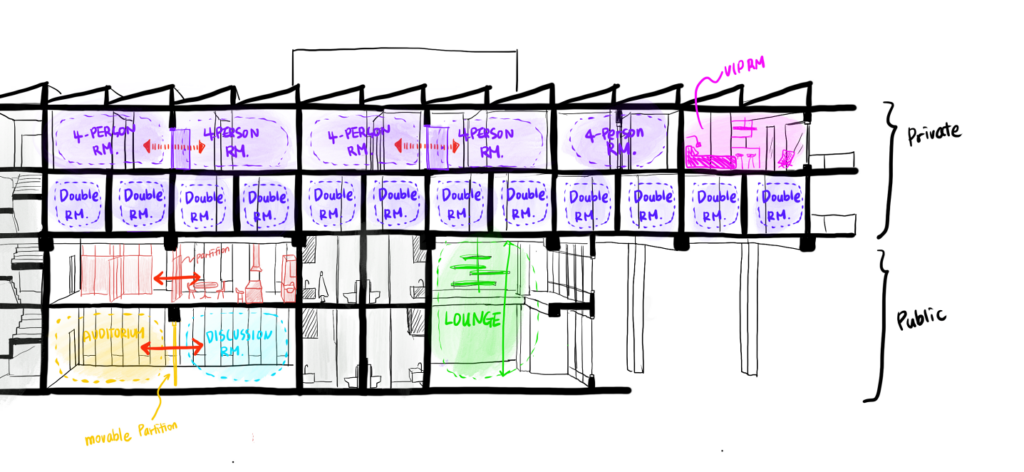 In order to provide spaces of various sizes according to the program of the education, I devised a space with partitions that can divide the space with movable walls in the auditorium and dining hall. In addition, I designed the flexible the accommodation that the 4-person room can be expanded to 8-person room by installing folding doors between the 4-person rooms.