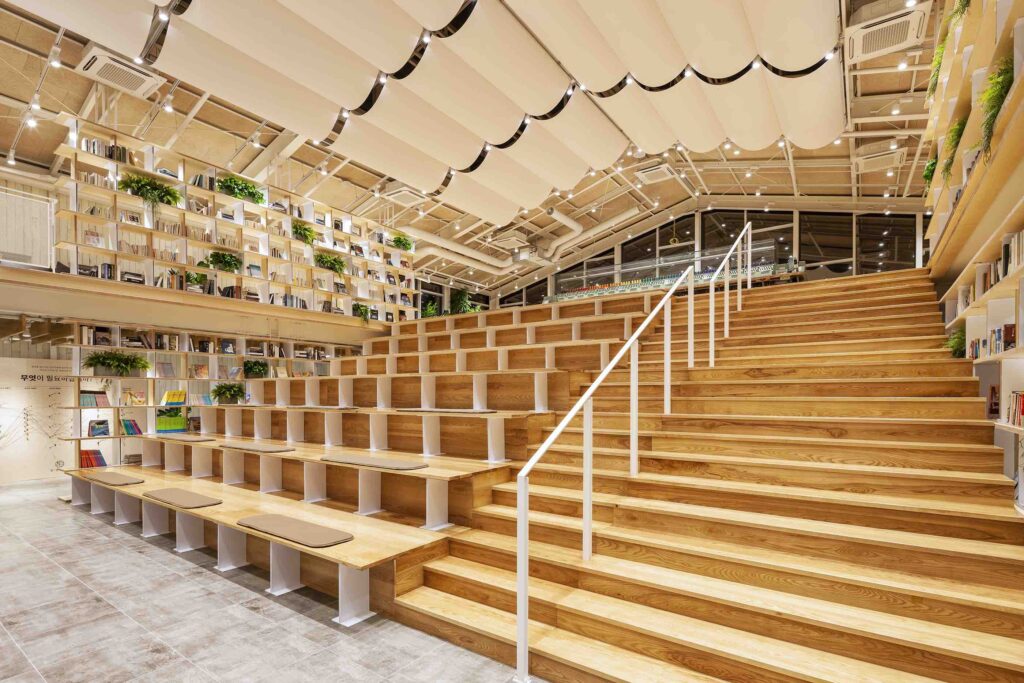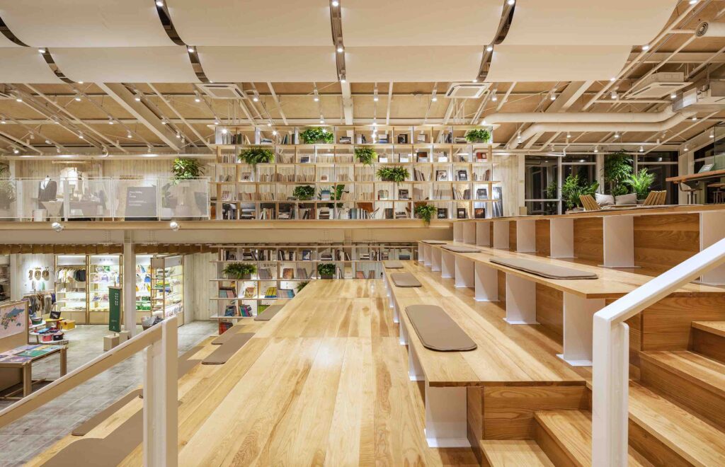 In order to smooth the movement of customers in the form of a masses, large stand stairs were planned. Here, a space for reading and relaxing was born. Designed to be able to see through numerous bookcases to feel the expandability of the space.