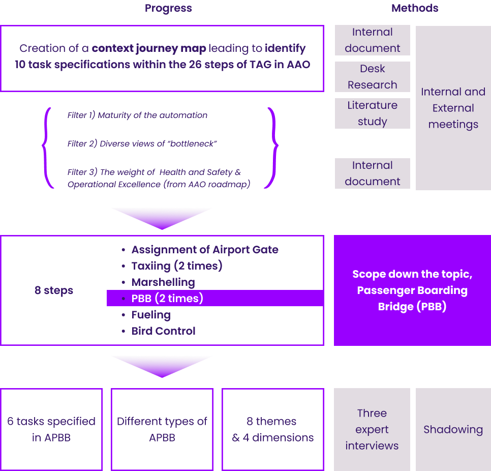 Among many steps in AAO, this study decided to focus on Passenger Boarding Bridge (PBB) (Figure 5) based on preliminary research including literature study, context research (i.e., shadowing(Figure 6)).