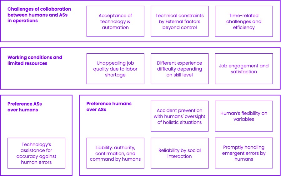 The main insights indicate that high-precision tasks are identified as potential candidates for AS delegation, while tasks requiring clear communication and meticulous inspection align better with human management. The study underscores the significance of effective information exchange, emphasizing the multifaceted roles of humans beyond mere data exchange.