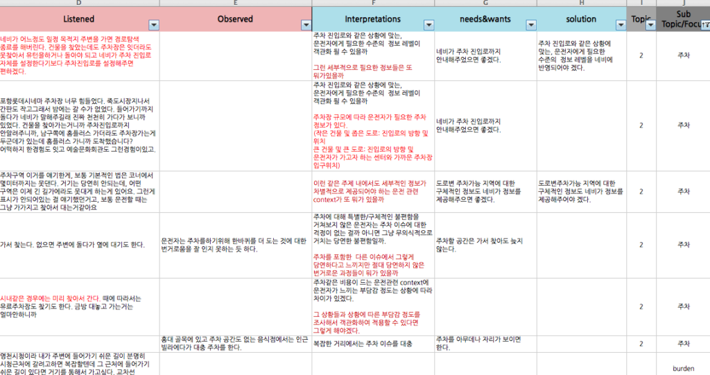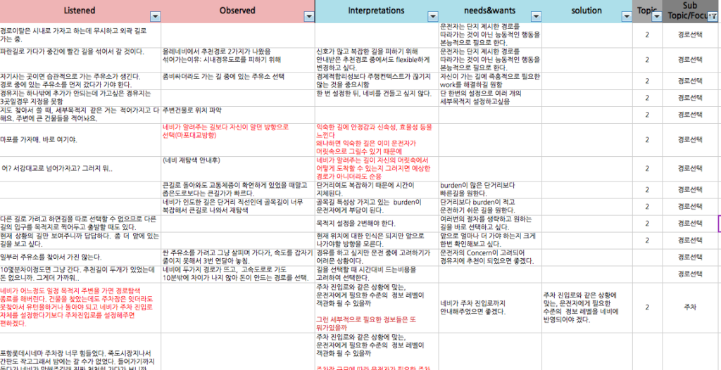We listed up the factual issues from a record of all kinds of research. These could be the words that were mentioned in the interview and description about unconscious behaviors of drivers captured from UT. And then, we put a mark on important issues and grouped them by similar topics using Excel filter, so we could deduct the core issues synthesized.